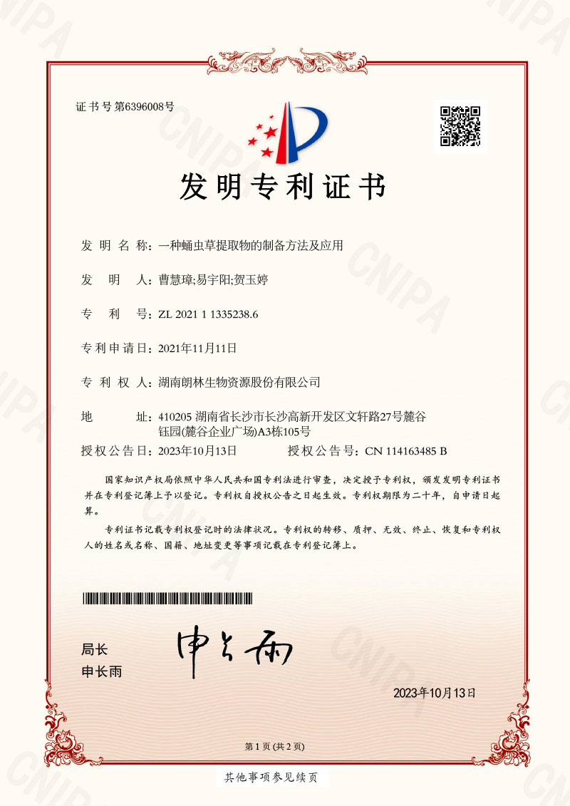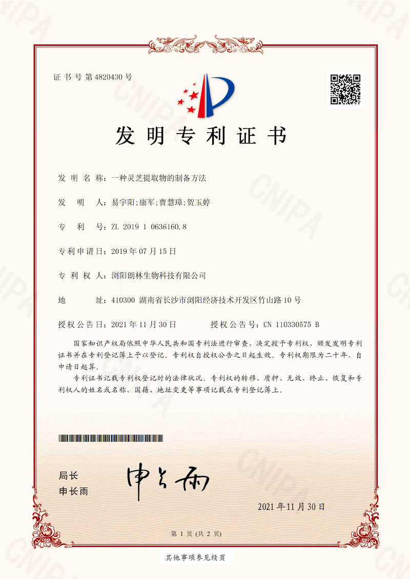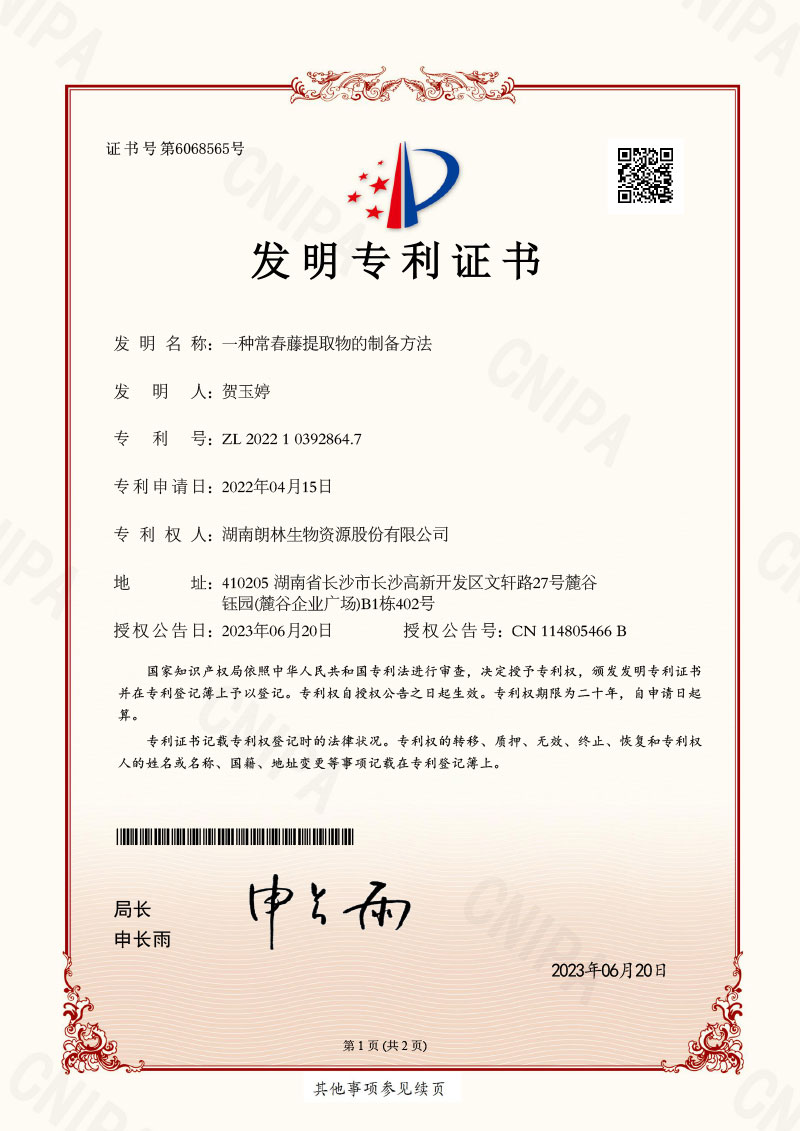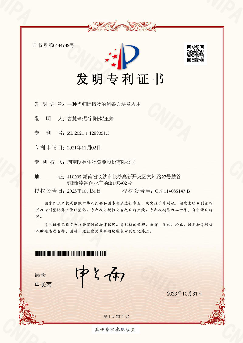 朗林生物注重產(chǎn)品的研發(fā)與創(chuàng)新,擁有多項(xiàng)植物提取工藝及其產(chǎn)品應(yīng)用的發(fā)明專利。 主要發(fā)明專利有: